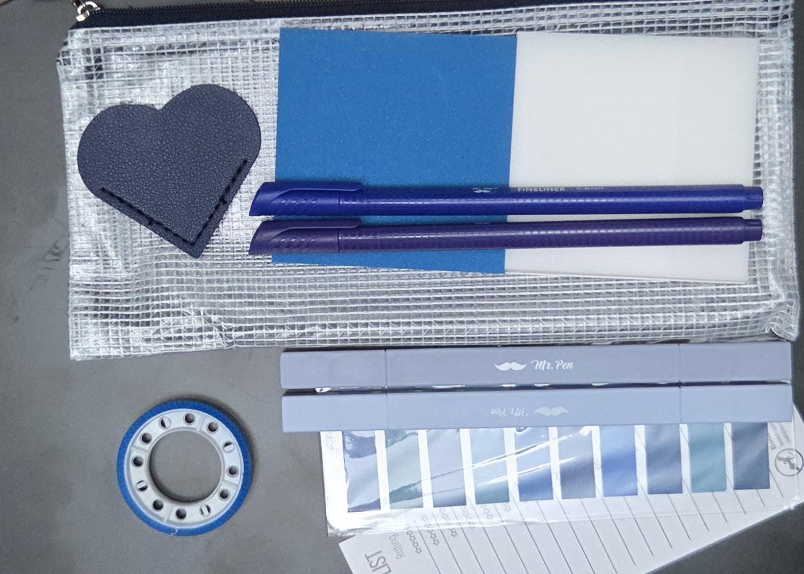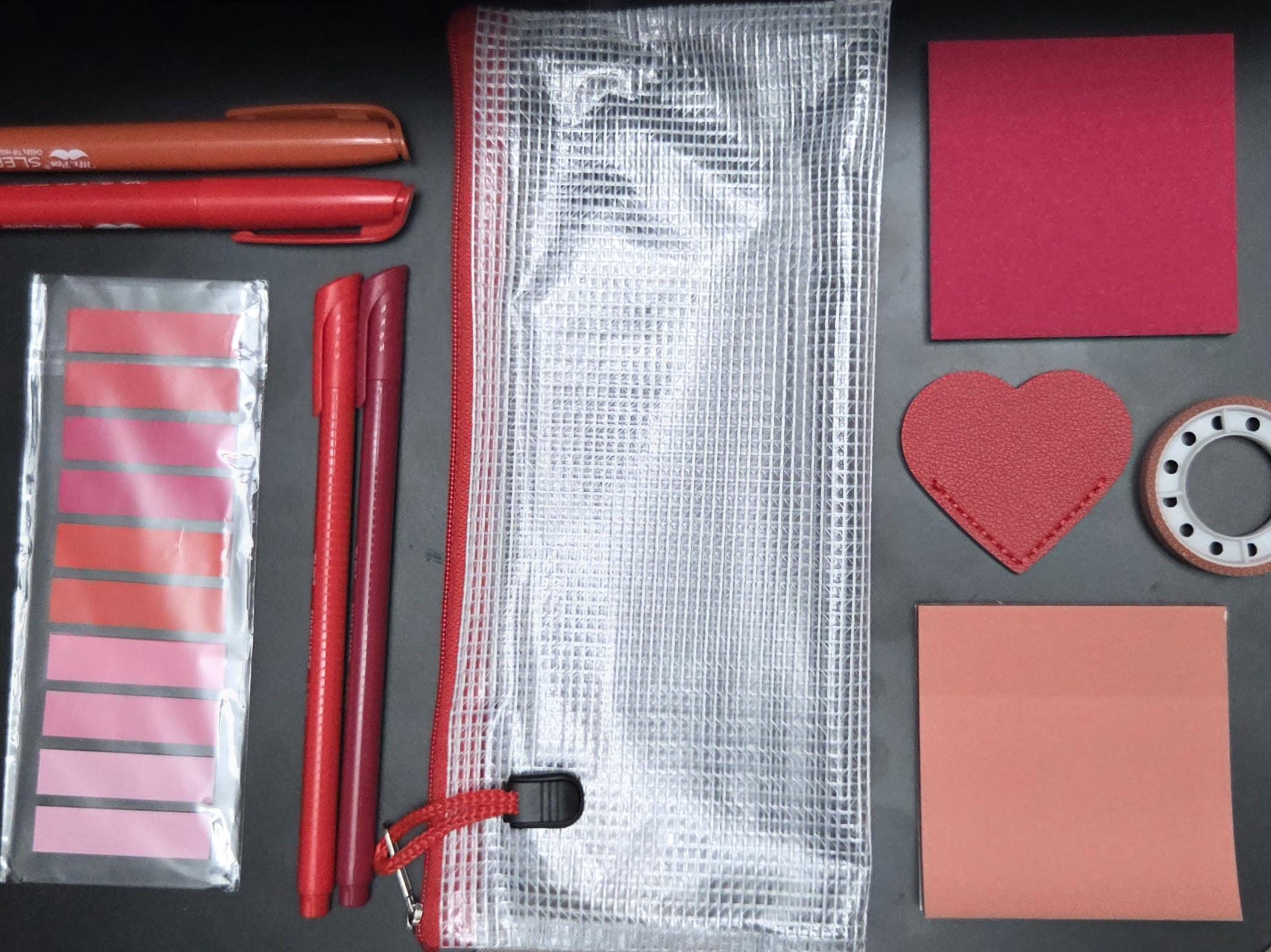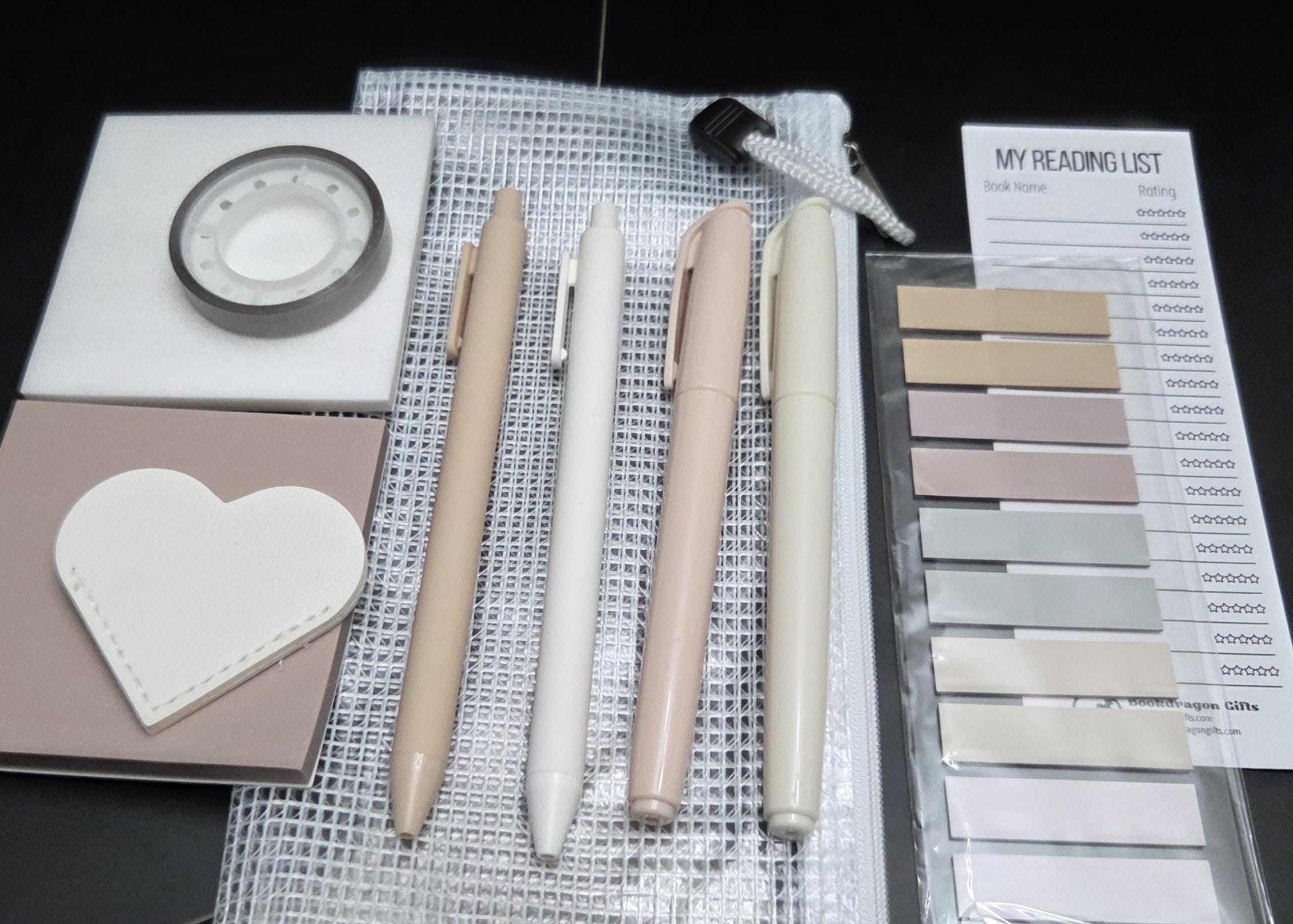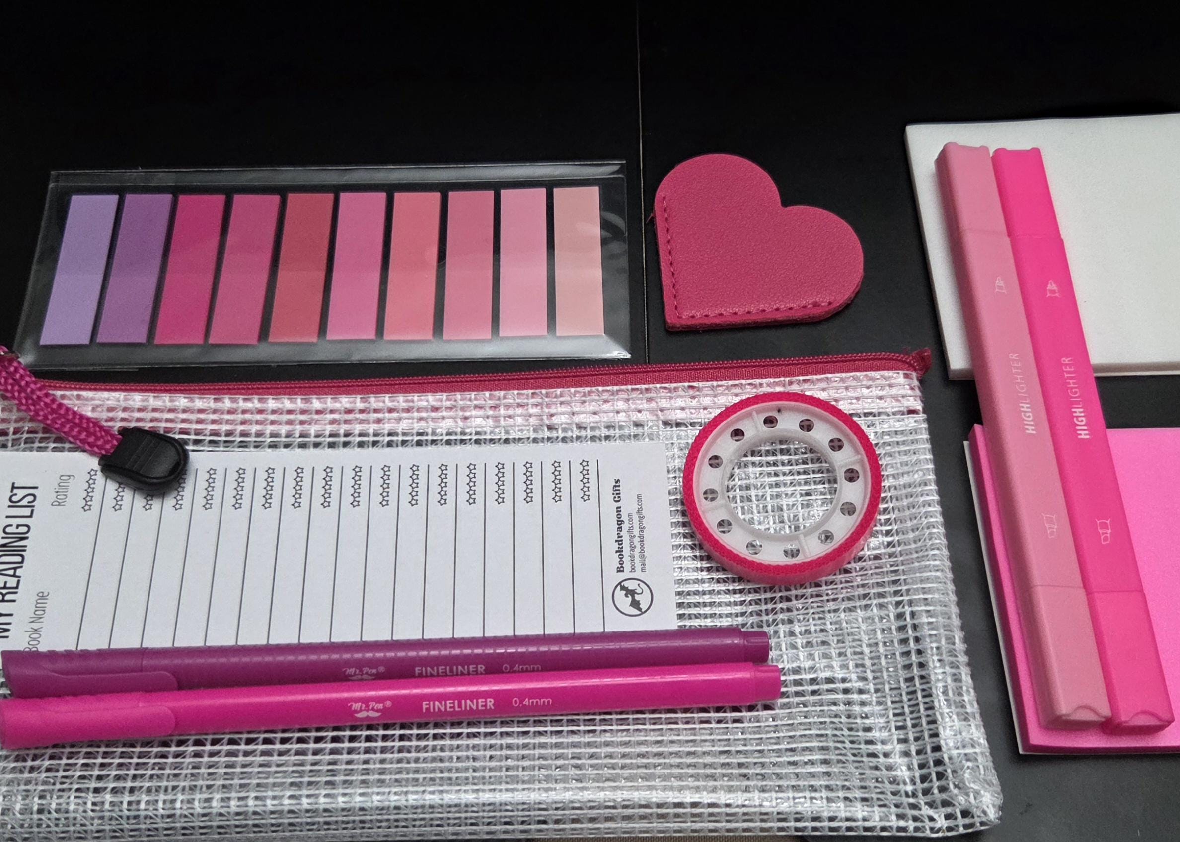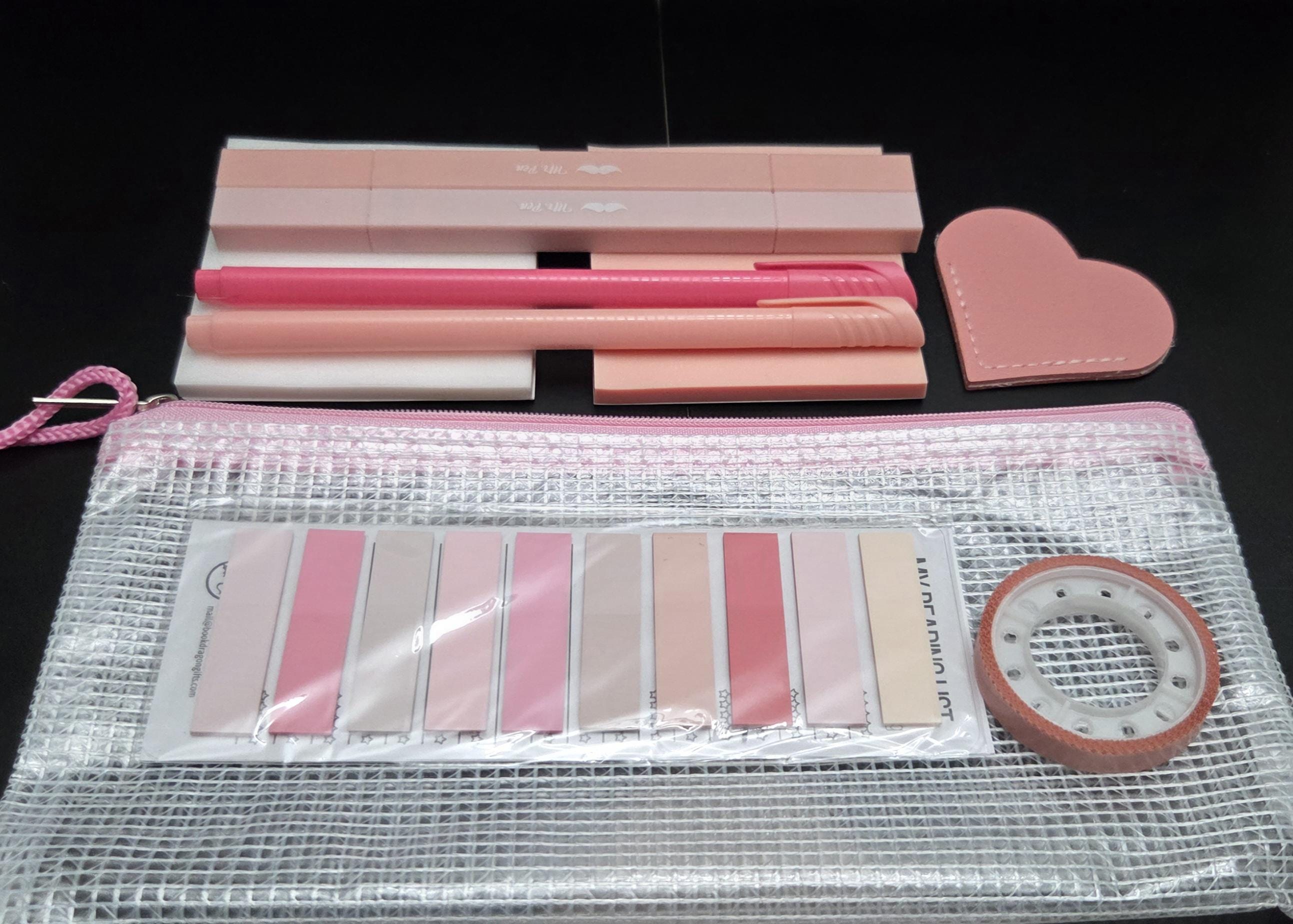 1 mesh zipper pouch 2 highlighters in various hues 2 pens in various hues 2 3x3 transparent notepads 1 sheet of sticky tabs 1 roll of transparent highlighter tape 1 corner bookmark 1 book tracker bookmark