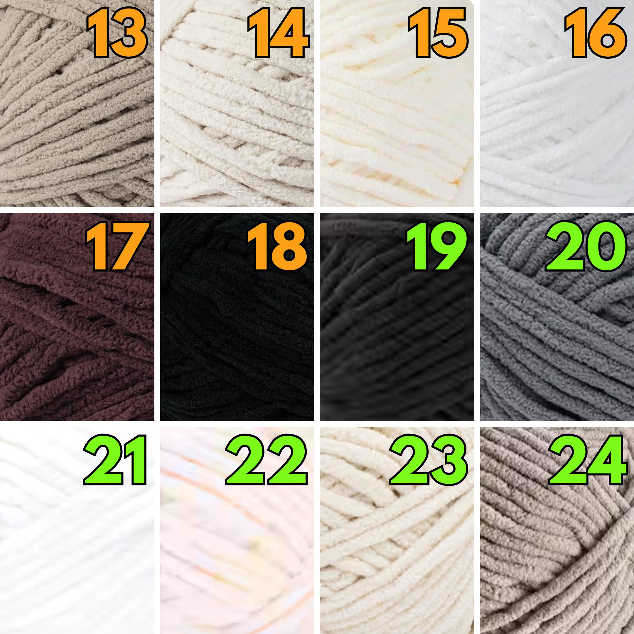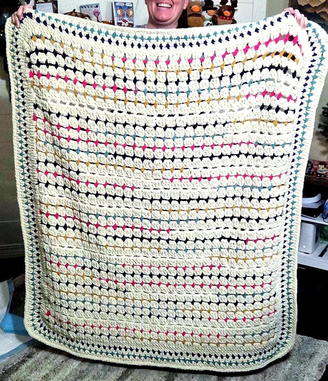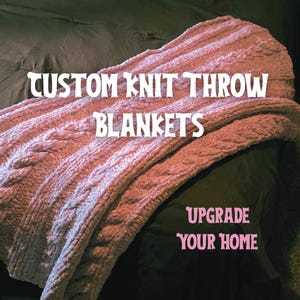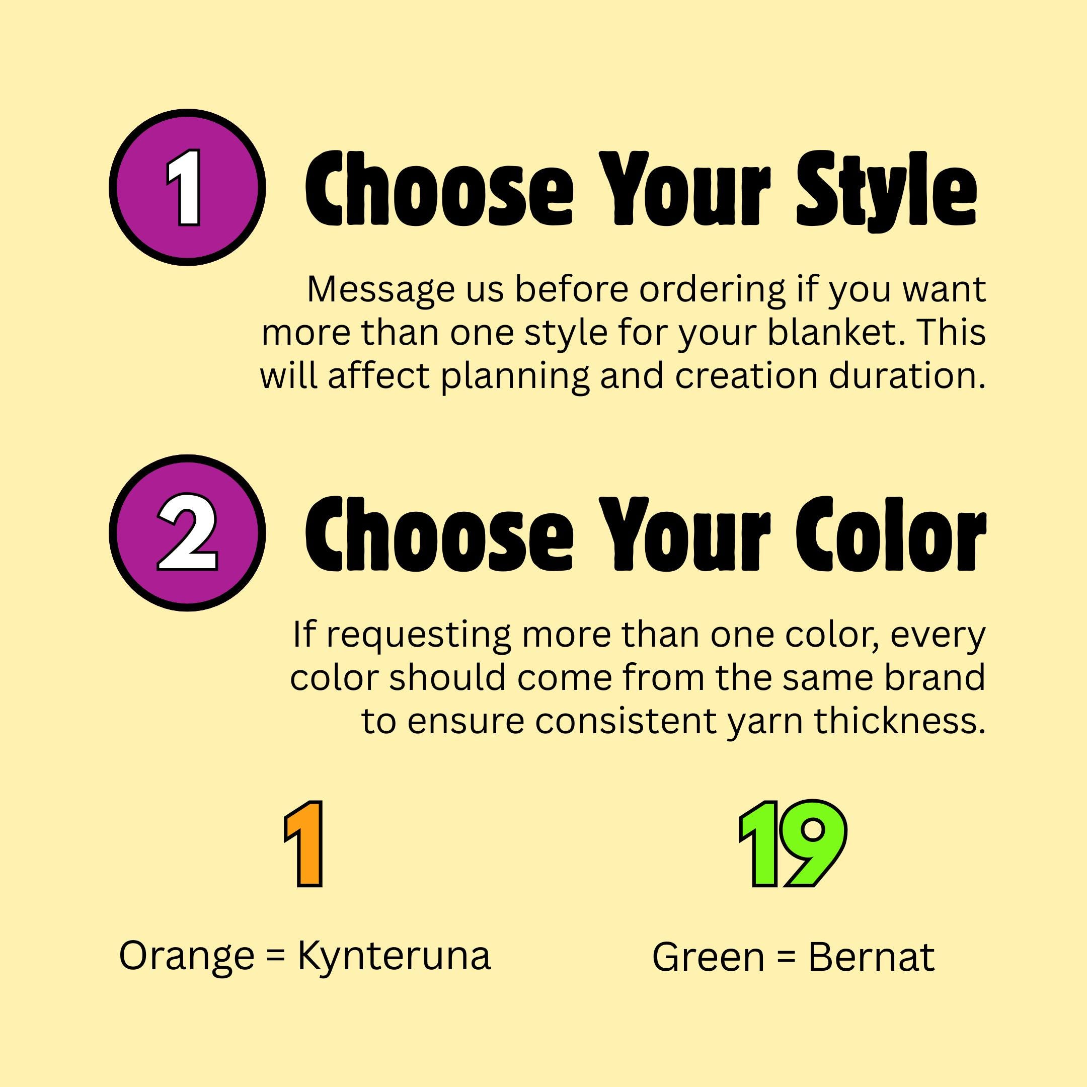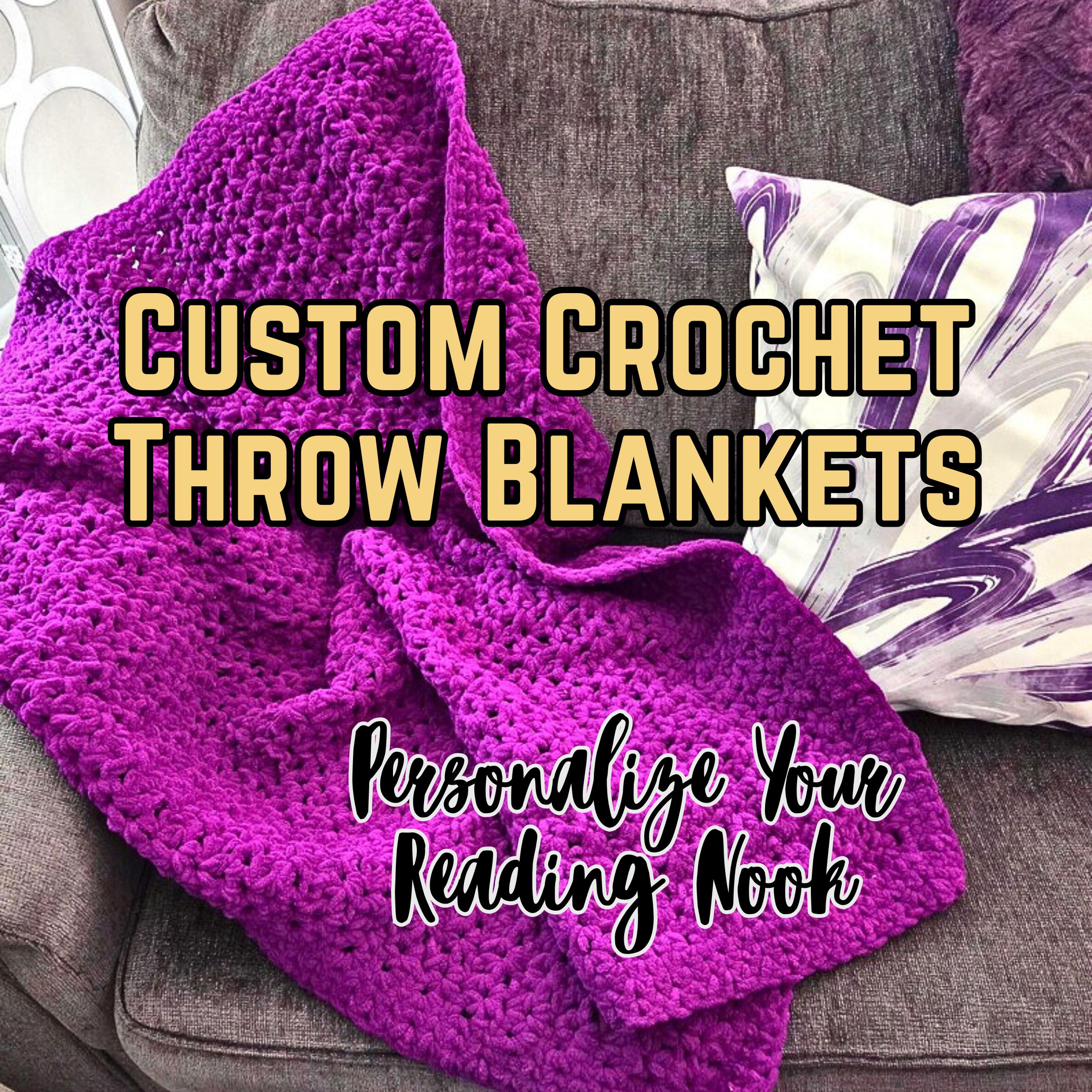 A hand-knit cozy crochet throw blanket with #6 super bulky yarn, either Knyteruna or Bernat Blanket brand. If choosing multiple colors, please stick with the same brand as the brands differ on yarn thickness just enough that it would be noticeable to see them beside one another in a throw blanket. The brands are denoted by the color of the numbers on the color choices: Knyteruna is golden yellow (#1--#18); Bernat is bright green (#19--#84).